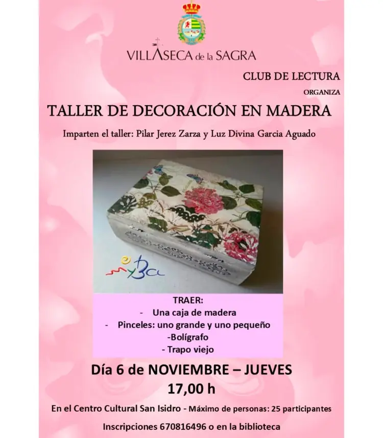 🖌️✨ Taller de Decoración en Madera El Club de Lectura de Villaseca de la Sagra organiza un nuevo taller creativo para dar vida a tus ideas y personalizar objetos con encanto. 📅 Jueves 6 de noviembre 🕔 17:00 h 📍 Centro Cultural San Isidro 👩🎨 Imparten: Pilar Jerez Zarza y Luz Divina García Aguado 🧰 M
