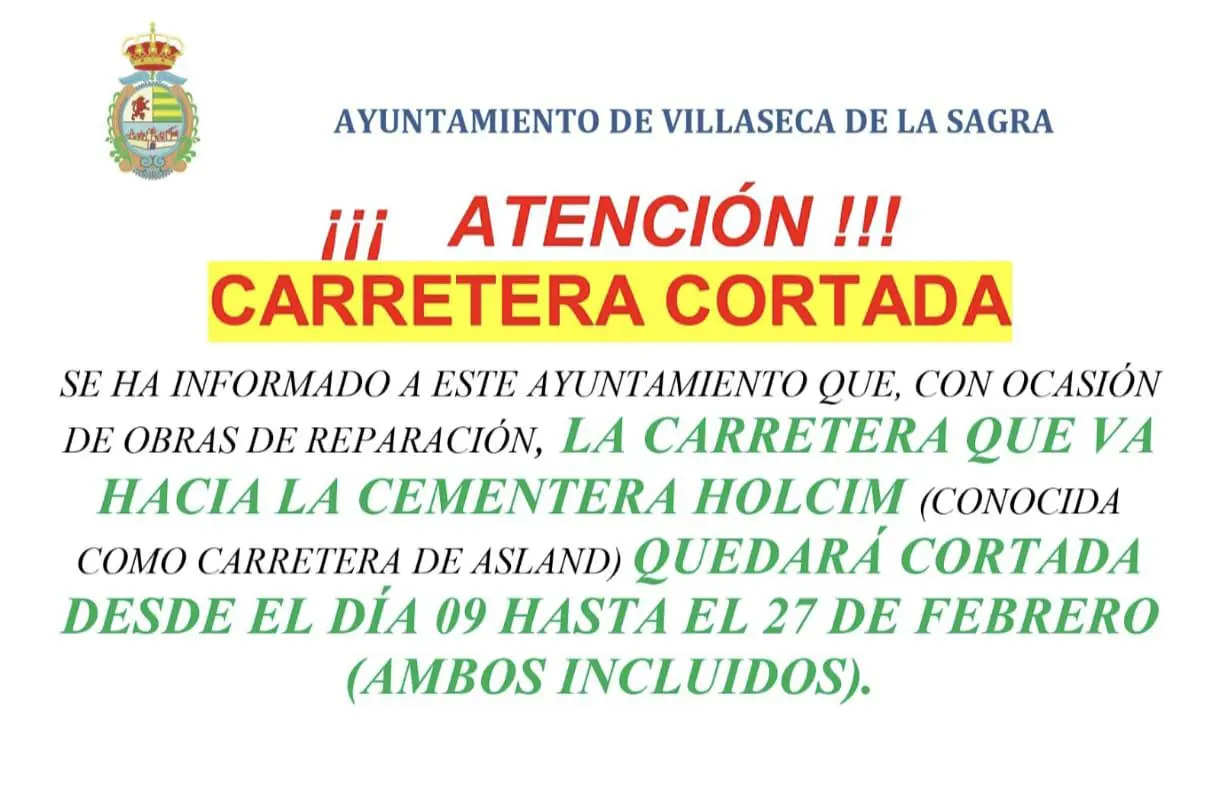 Se ha informado a este Ayuntamiento que, con ocasión de obras de reparación, LA CARRETERA QUE VA HACIA LA CEMENTERA HOLCIM (conocida como carretera de Asland) QUEDARÁ CORTADA DESDE EL DÍA 09 HASTA EL 27 DE FEBRERO (AMBOS INCLUIDOS)